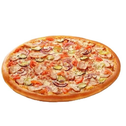 ВЕТЧИНА,БЕКОН,КОЛБАСКА ПК, ПОМИДОРЫ,ОГУРЧИКИ МАРИНОВАННЫЕ,СОУС МУТТИ, СЫР МОЦАРЕЛЛА,ТЕСТО ДРОЖЖЕВОЕ ТОНКОЕ 580ГР.