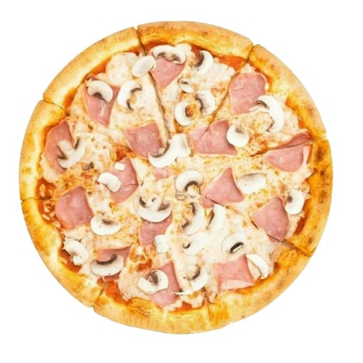 СОЧНА ПИЦЦА С ВЕТЧИНОЙ И ГРИБАМИ,СЛИВОЧНЫМ СОУСОМ ,СПЕЦИЯМИ И СЫРОМ МОЦАРЕЛЛА.
