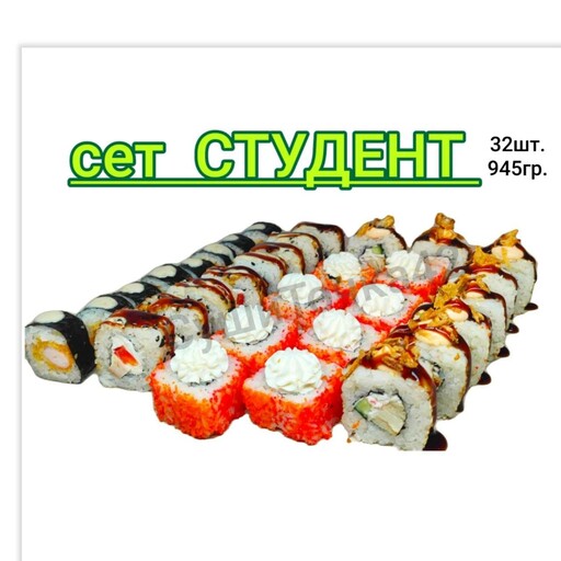 Сет 32шт. 1045гр. в состав входят: ролл с креветкой темпура ролл Цезарь с курицей ролл Калифорния Чиз с копченым лососем ролл ОмуретСу Криспи